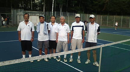早速2時から、昨年直したばかりの北京オリンピック仕様のすばらしいテニスコートを使い5時まで練習試合。若さいっぱいのプレーを皆さんご披露されました。終了後、風呂ですっきりした後は、馬刺し付きの夕食、砂川さん小池さん差入れの美酒に舌鼓。その後、部屋でも懇談会をもちました。