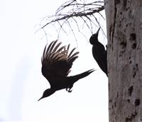 『クマゲラ』の雄(♂)が巣を飛び出したところで、雌(♀)が木