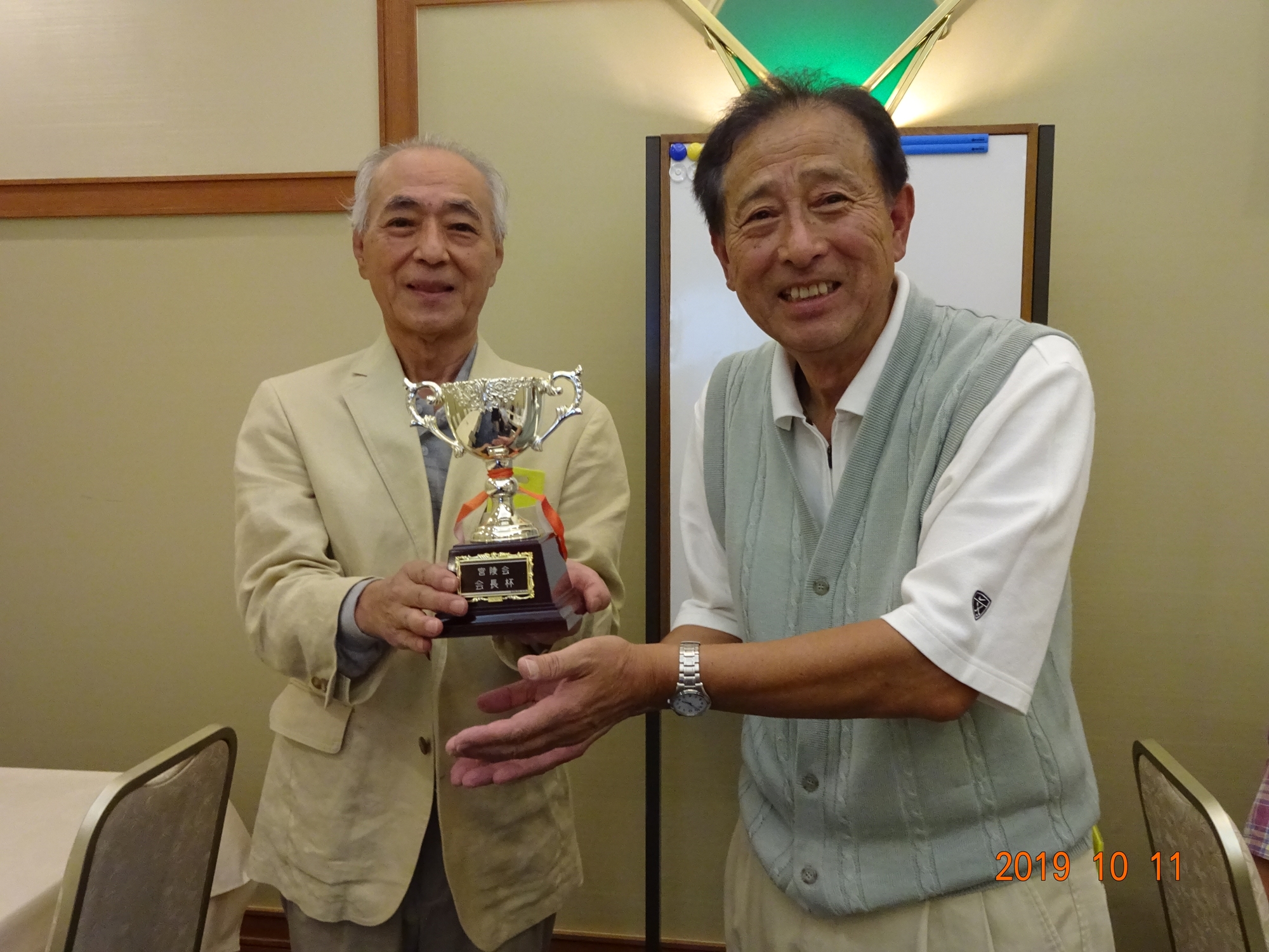 結果は、優勝-佐藤美佐男、準優勝-村田義郎氏、3位-初参加の柏木忠雄氏、B/B賞-阿部好伸氏、ベスグロ-前回優勝の萩原力氏、ニアピン賞は、イン10番塚田尚氏、13番村田義郎氏、アウト4番と8番鈴木和夫氏が受賞しました。